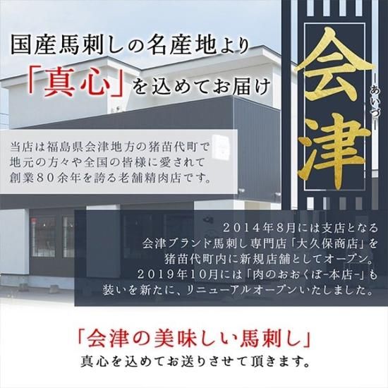| 商品コメント | 会津ブランド馬刺しは、【赤身で旨み】に徹底的にこだわった馬刺しの常識を覆す馬刺しです! ロースは馬刺しの中では最も旨みがあり、「もも」に比べてやわらかさもあります。当店の人気ナンバーワン馬刺しです。 |